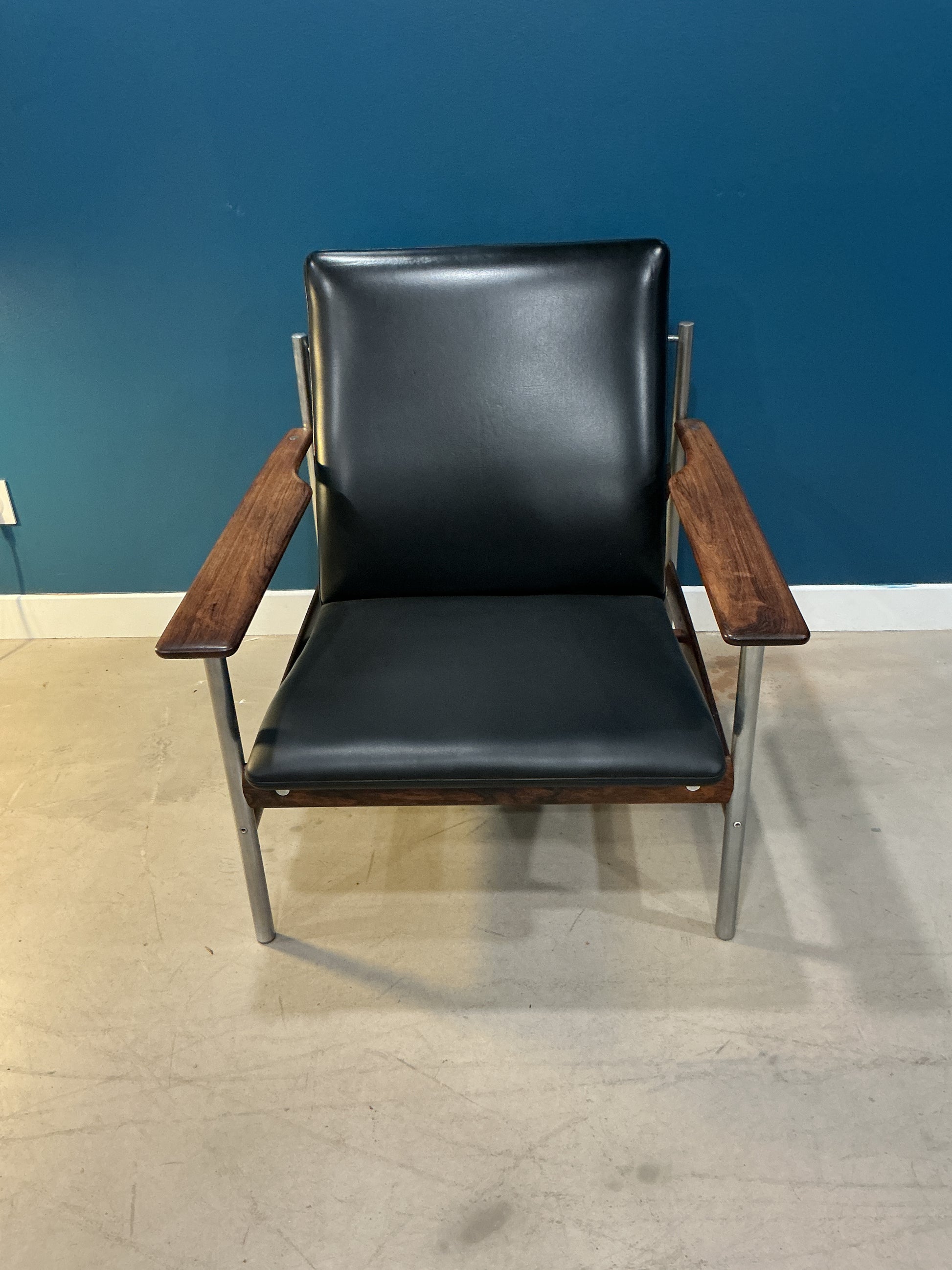 Le fauteuil 1001 AF incarne l'essence du design scandinave des années 1960. Créé par Sven Ivar Dysthe pour Dokka Møbler, ce classique norvégien allie la noblesse du noyer massif à l'épure d'un piètement en acier inoxydable. Son assise généreuse en cuir Sorensen garantit un confort optimal. Avec ses proportions équilibrées (71 × 75 × 78 cm) et son poids maîtrisé de 19 kg, il s'intègre harmonieusement dans tout intérieur. Une pièce d'exception pour les collectionneurs de mobilier moderne.