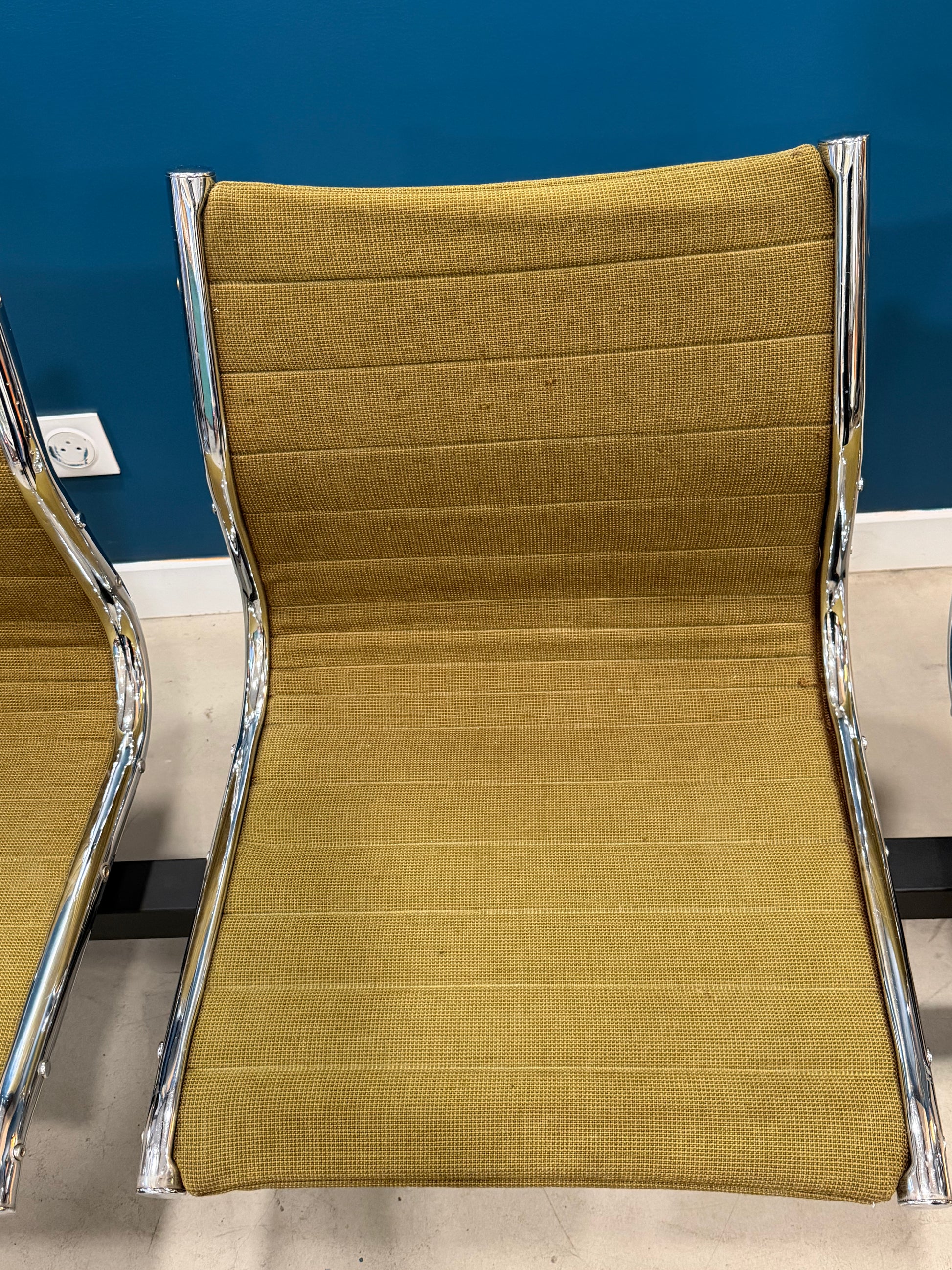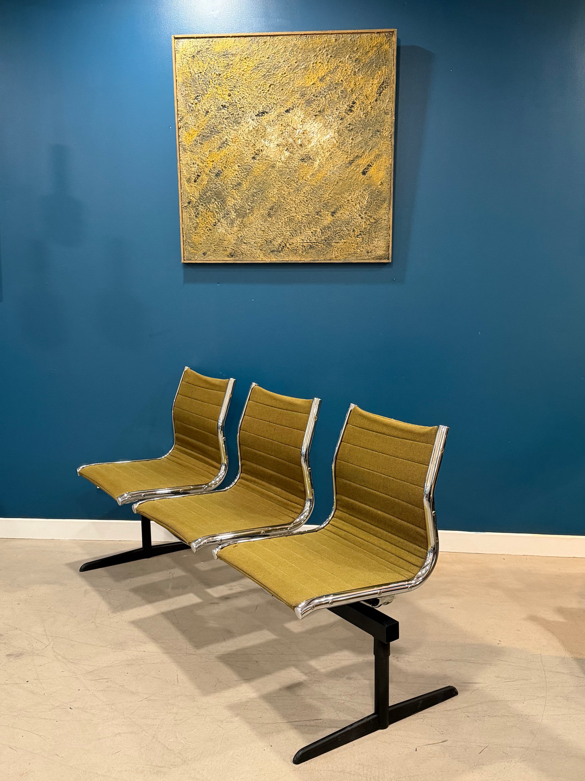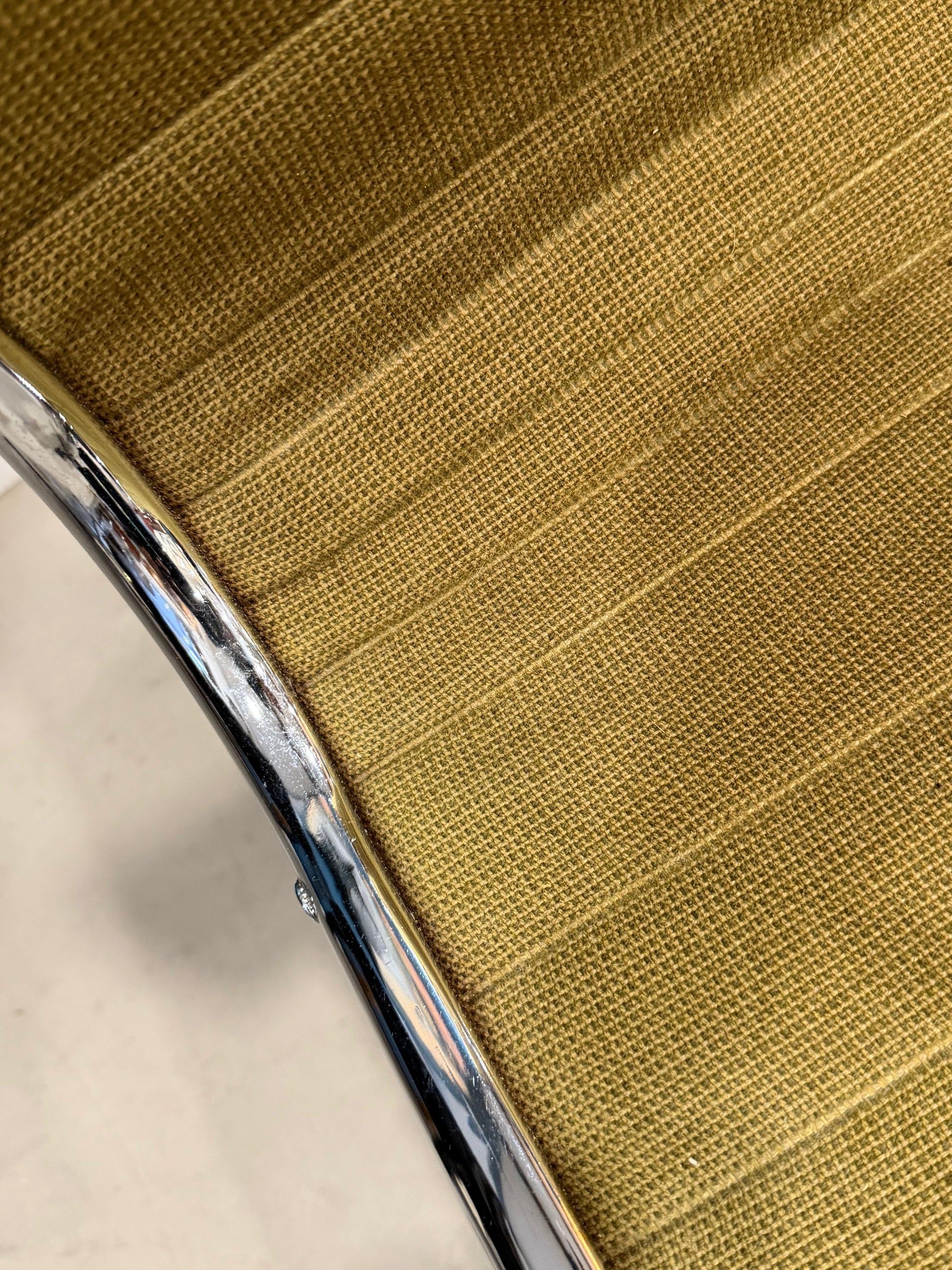 Banc de salle d'attente trois places des années 80, incarnant l'esthétique épurée du design contemporain. Structure chromée en inox, assises en tissu vert d'époque, pieds renforcés par barre latérale. Mesurant 165 cm, de long, ce meuble vintage affiche quelques legeres marques de son usage. Idéal comme banc d'entrée ou élément de décoration intérieure, il apporte caractère et fonctionnalité à tout espace. Pièce de qualité, inspirée par les grands maîtres du mobilier moderne.