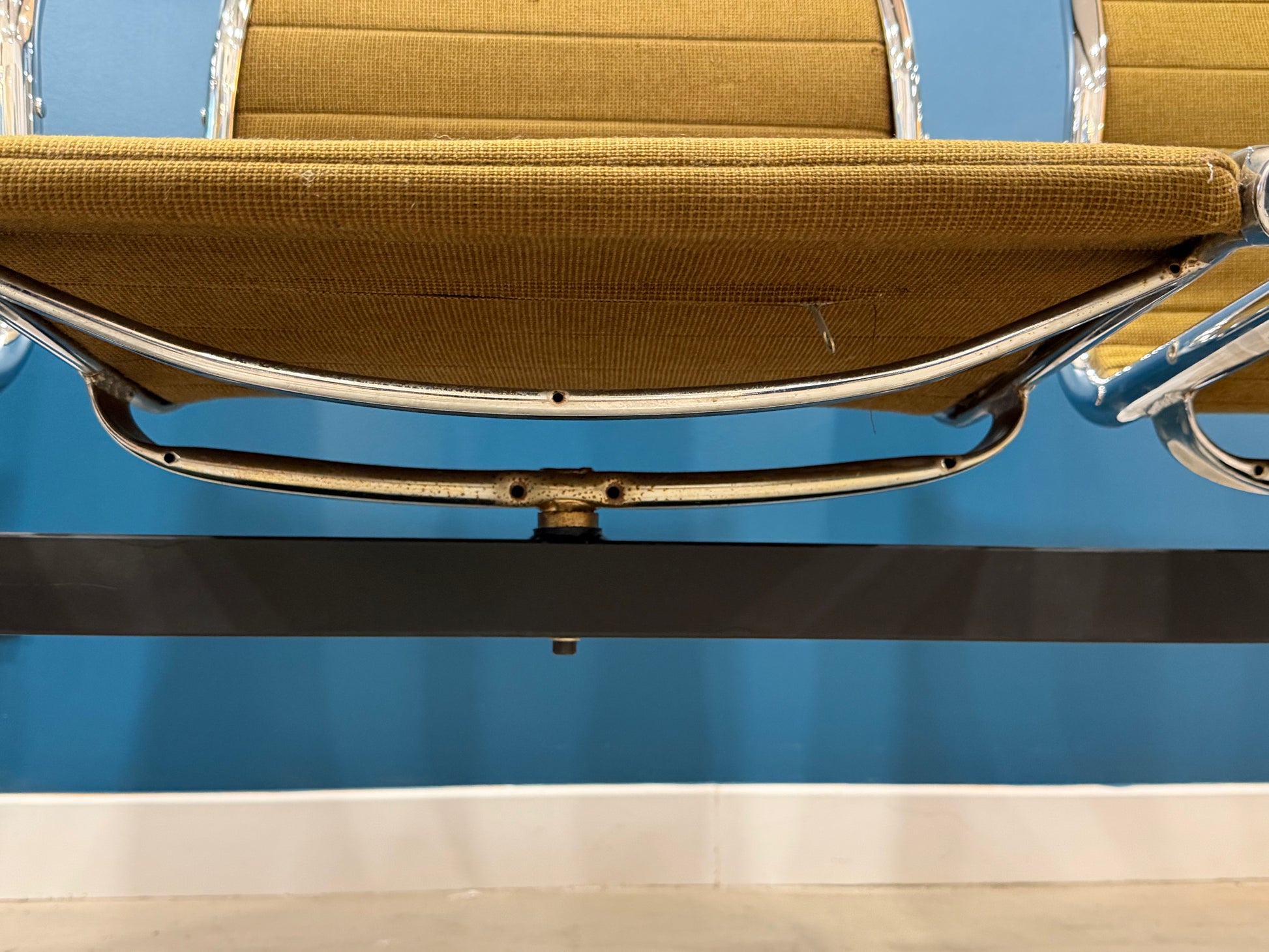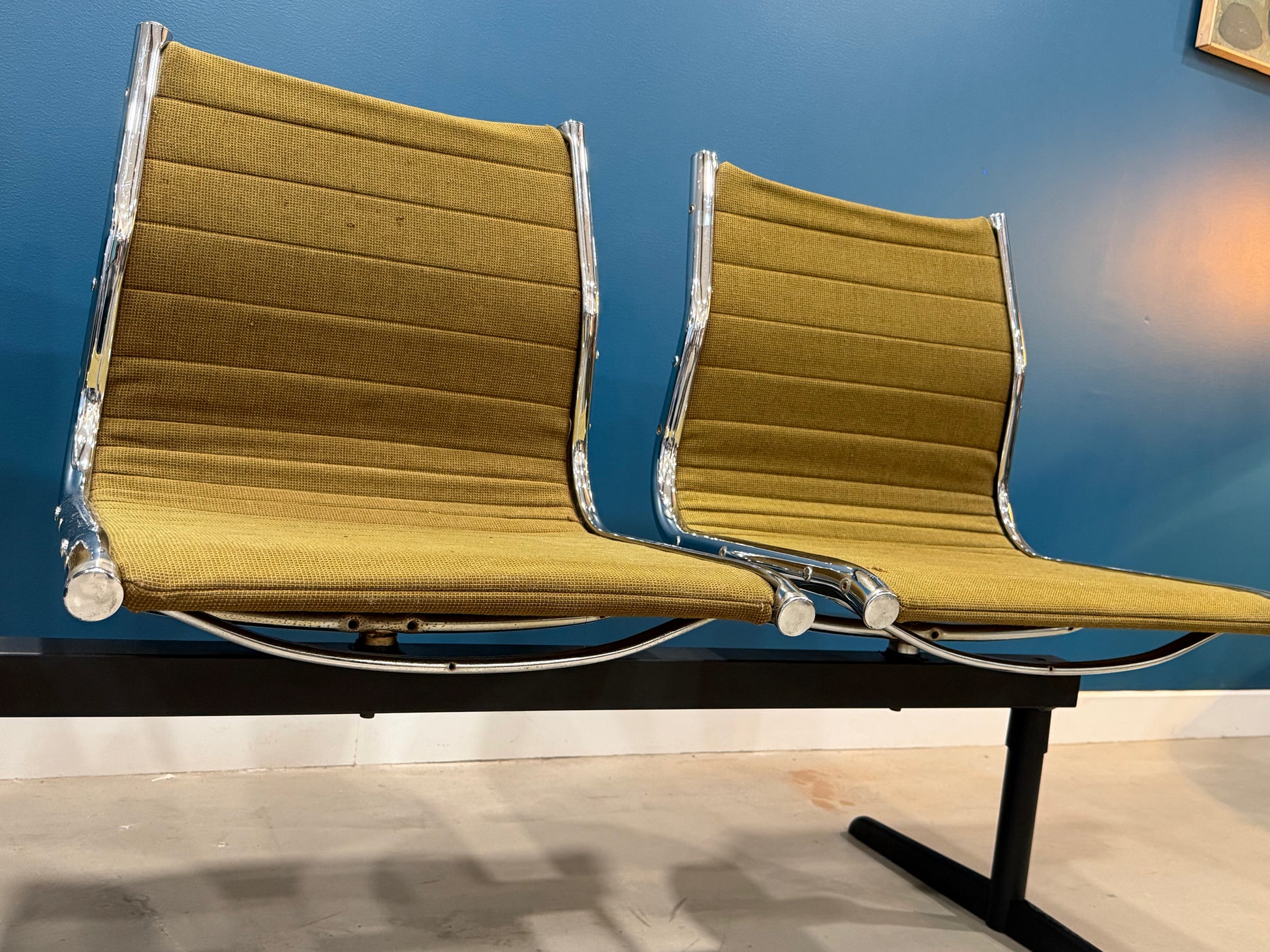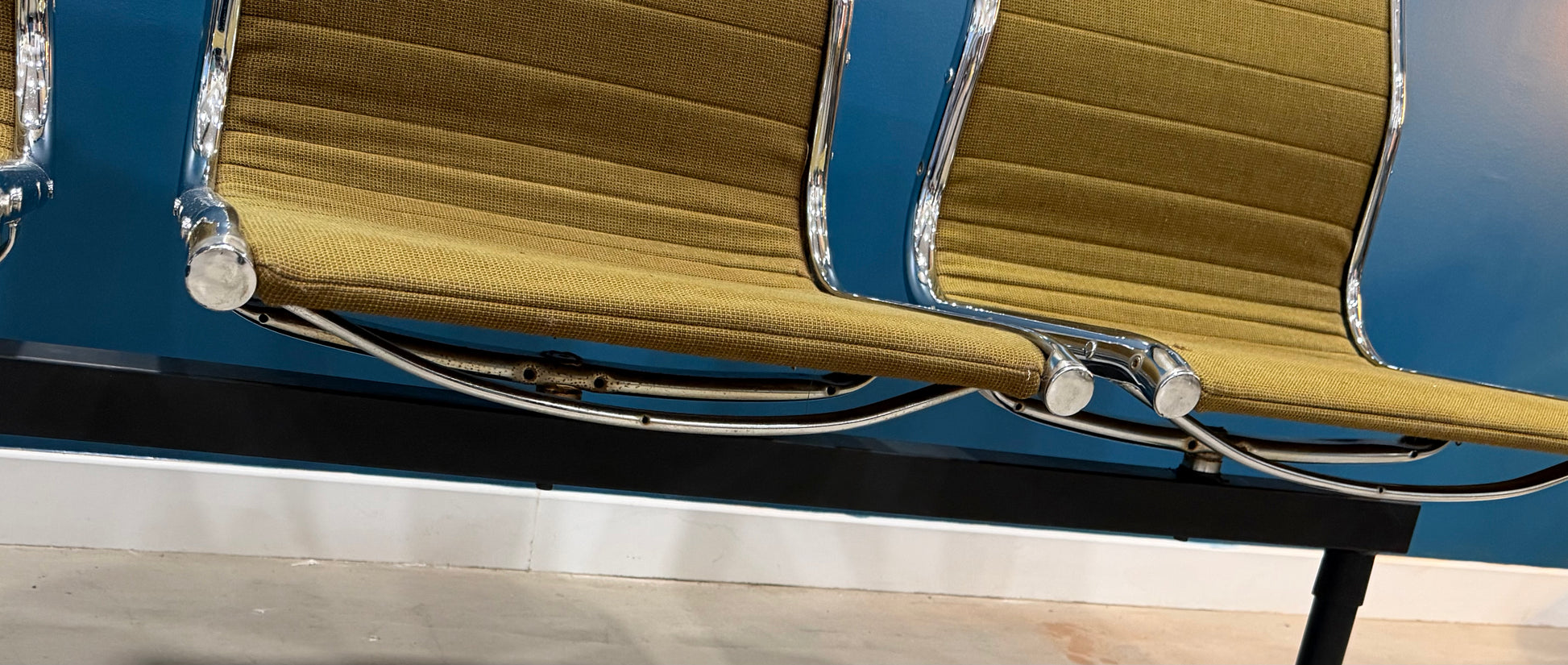 Banc de salle d'attente trois places des années 80, incarnant l'esthétique épurée du design contemporain. Structure chromée en inox, assises en tissu vert d'époque, pieds renforcés par barre latérale. Mesurant 165 cm, de long, ce meuble vintage affiche quelques legeres marques de son usage. Idéal comme banc d'entrée ou élément de décoration intérieure, il apporte caractère et fonctionnalité à tout espace. Pièce de qualité, inspirée par les grands maîtres du mobilier moderne.