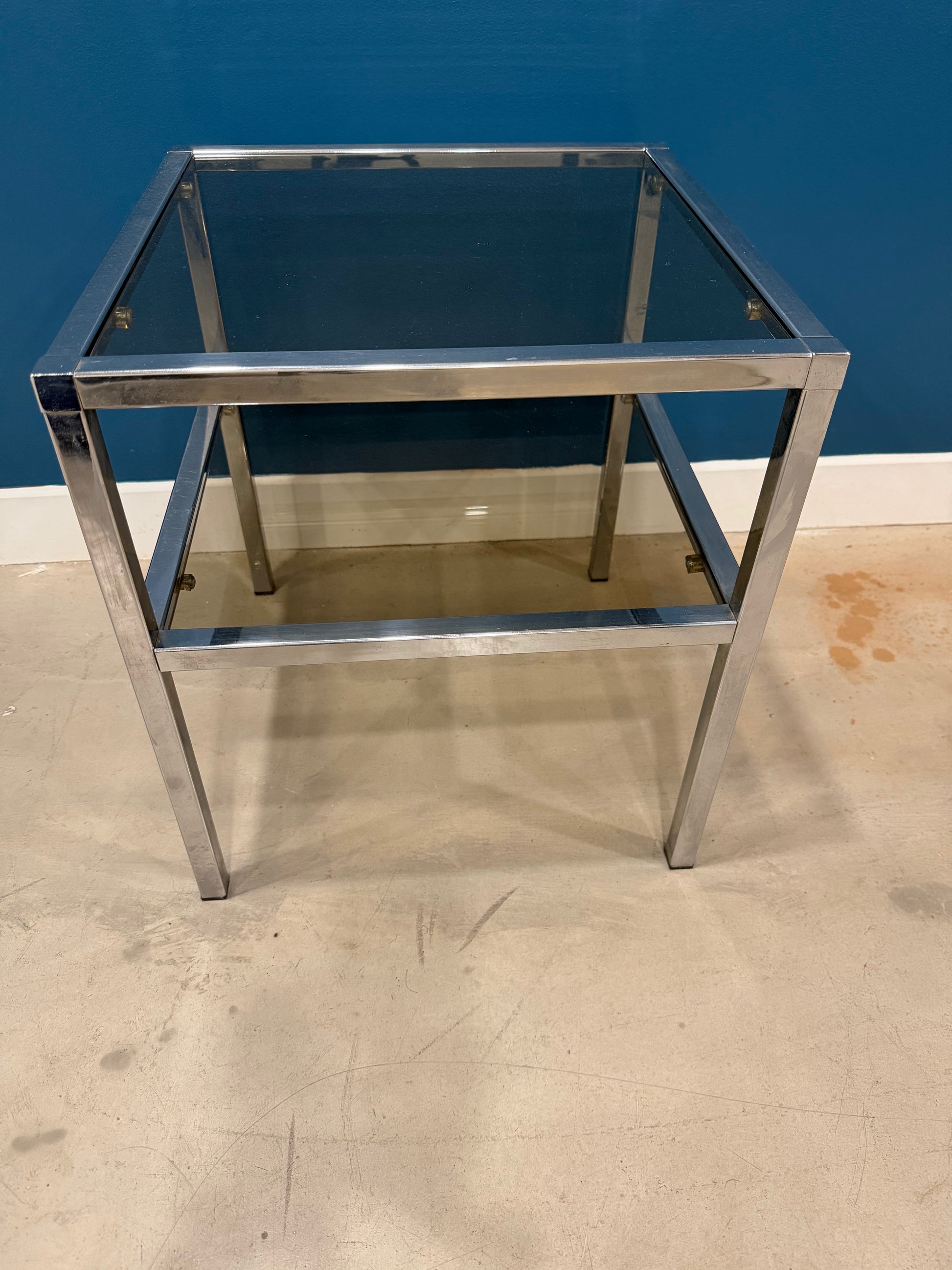 Bout de canapé vintage des années 70, véritable pépite pour sublimer votre intérieur rétro. Conçu avec deux plateaux en verre fumé élégant, il repose sur une structure inox chromée qui garantit solidité et durabilité. Ses proportions généreuses (41 x 41 cm de largeur pour 46 cm de hauteur) s'adaptent parfaitement à tous les espaces. Cette pièce authentique apporte une touche de nostalgie intemporelle à votre salon, idéale pour exposer vos objets de décoration préférés ou créer un point focal design.