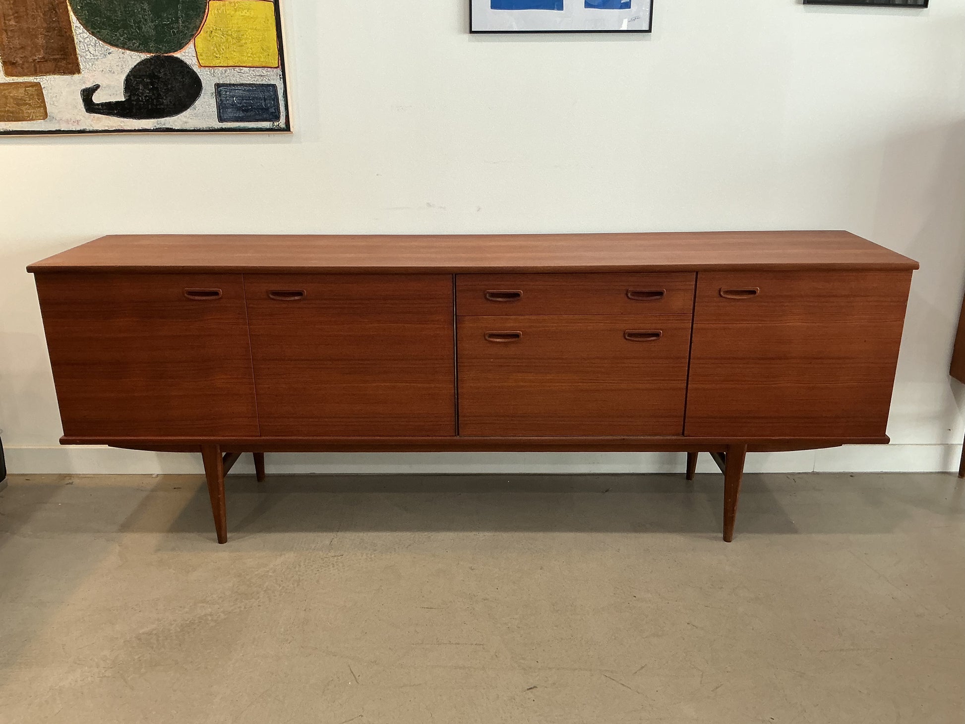 Enfilade scandinave en teck massif signée Olaf Horn, emblématique des années 1970. Cette pièce maîtresse conjugue fonctionnalité et élégance nordique avec son architecture épurée. Elle offre une organisation optimale grâce à un tiroir spacieux, deux placards de rangement et un bar intégré, idéal pour les amateurs de design vintage. Le teck, noble et durable, développe une patine chaleureuse au fil du temps. Un investissement intemporel pour les collectionneurs de mobilier scandinave authentique.