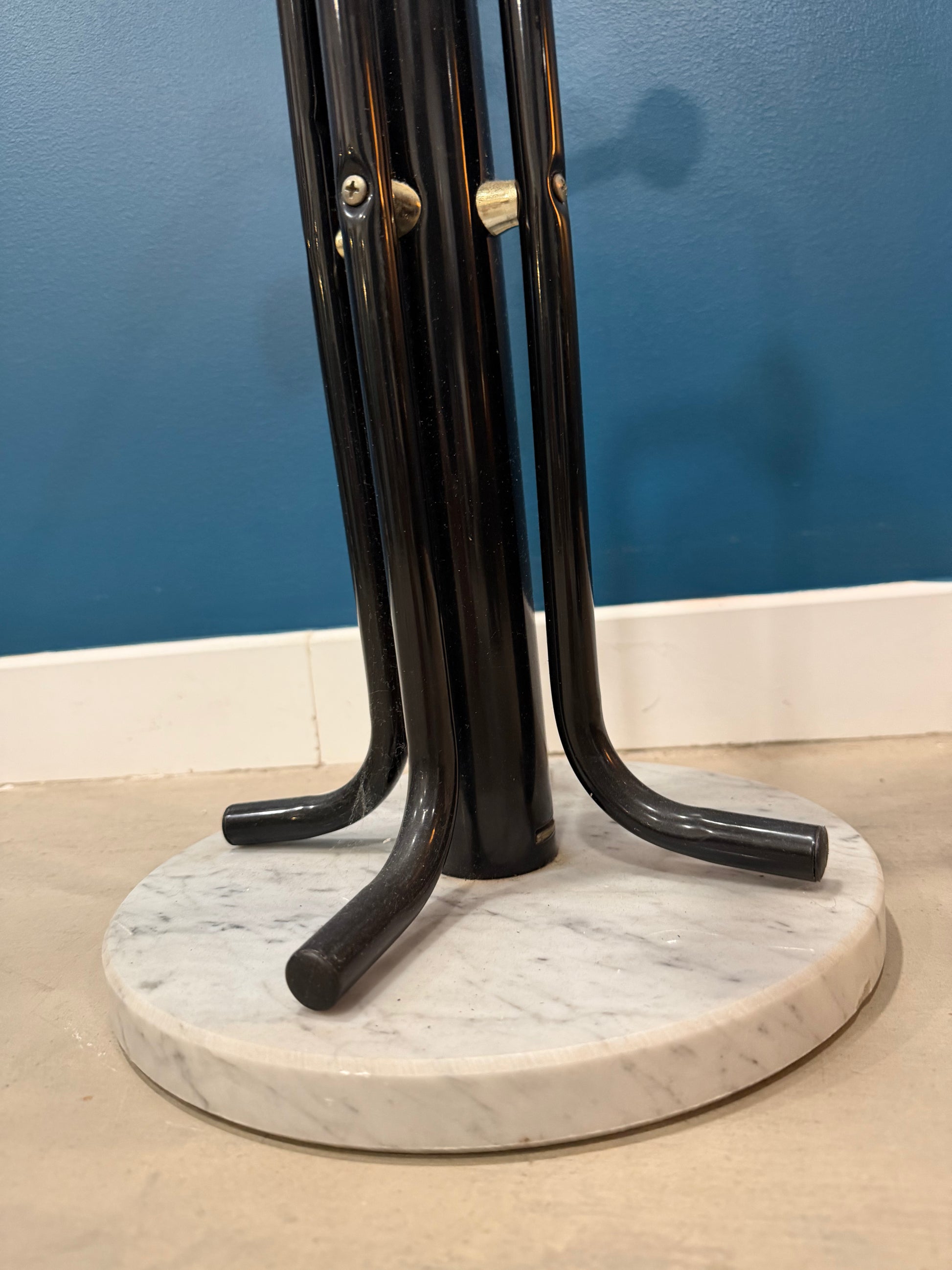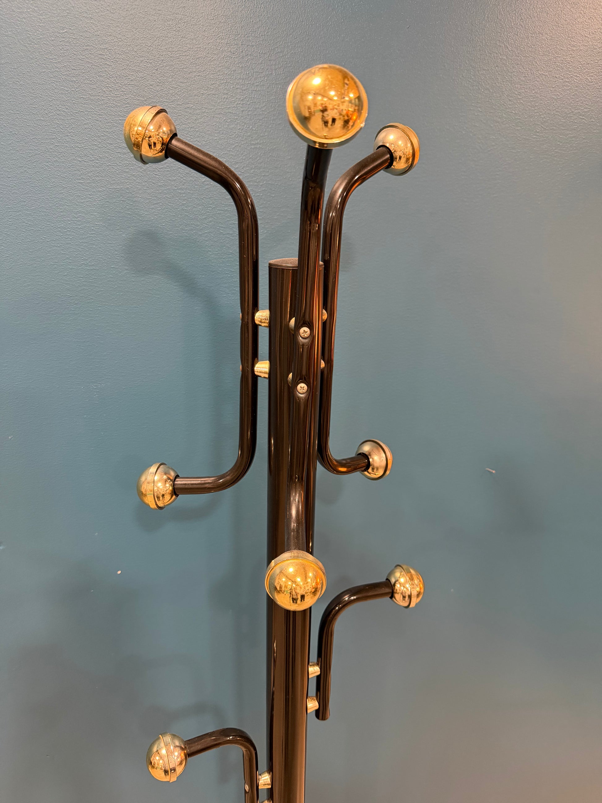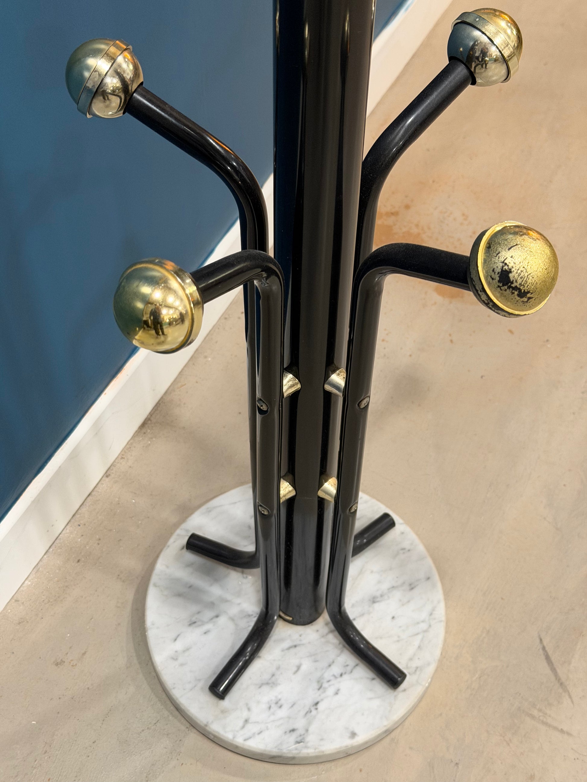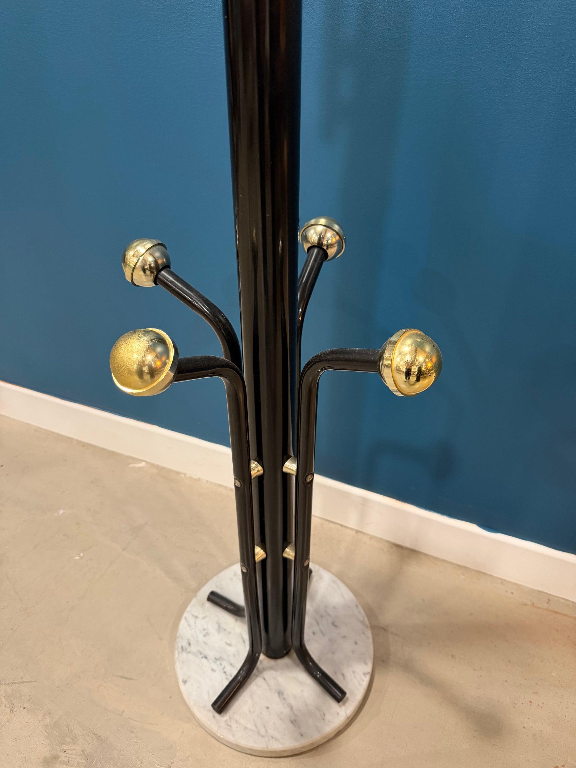 Porte-manteau d'époque années 70 conjuguant fonctionnalité et esthétique rétro. Base en marbre massif assurant un ancrage solide, structure métallique de conception robuste. Douze patères à finition dorée en plastique moulé, caractéristiques du design époque. Dimensions généreuses : 176 cm de hauteur, adapté aux espaces professionnels ou résidentiels de belle ampleur. Conservation satisfaisante reflétant un entretien régulier. Meuble de rangement incontournable pour qui recherche une pièce vintage authentique alliant praticité et signature stylistique du design des années 70.