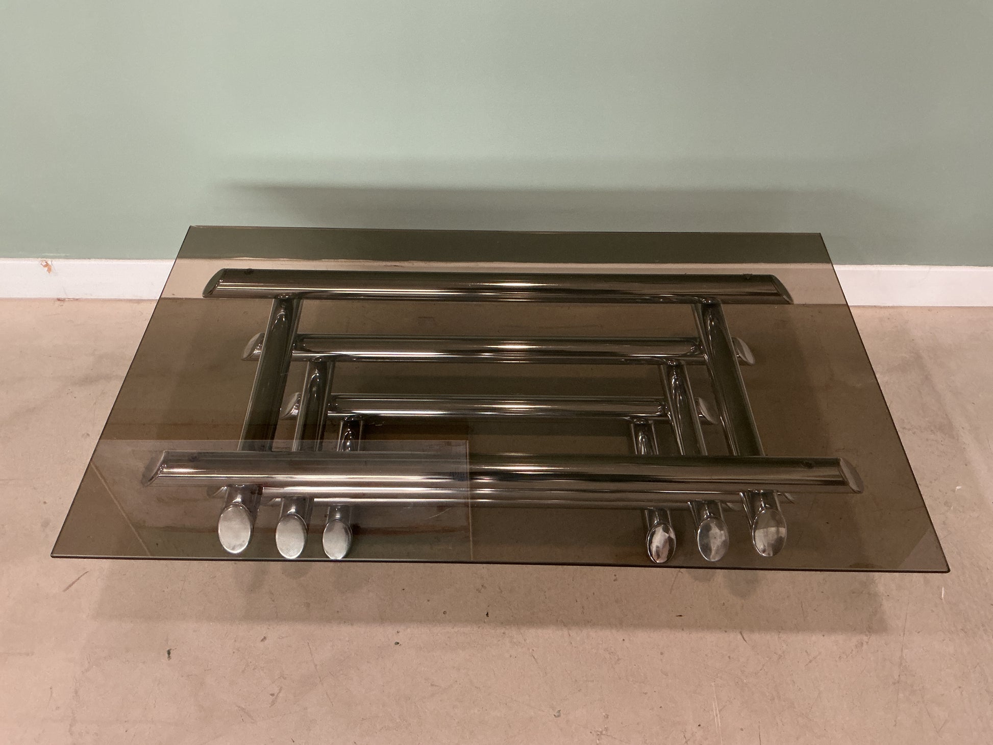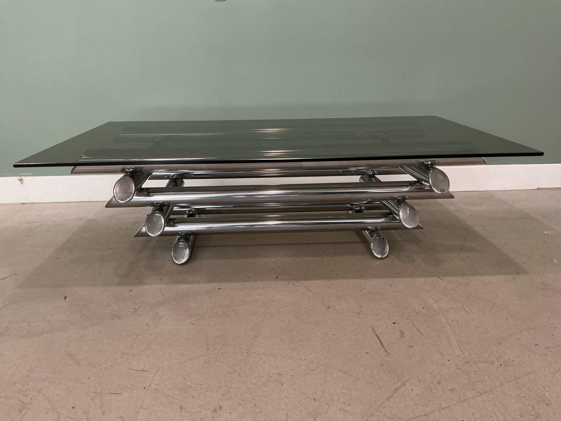 Table basse emblématique signée Willy Rizzo, datant des années 70. Cette pièce iconique conjugue élégance minimaliste et fonctionnalité avec sa structure en métal tubulaire et son plateau en verre fumé. Les dimensions généreuses (65 x 110 cm, hauteur 32 cm) en font un élément central de tout intérieur moderne. Le plateau présente une légère éclat, témoignage authentique de son histoire. Un classique du design industriel qui apporte sophistication et caractère à votre espace de vie.